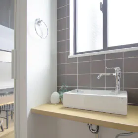 鏡として機能しながら、収納も兼ね備えた洗面台です。 -