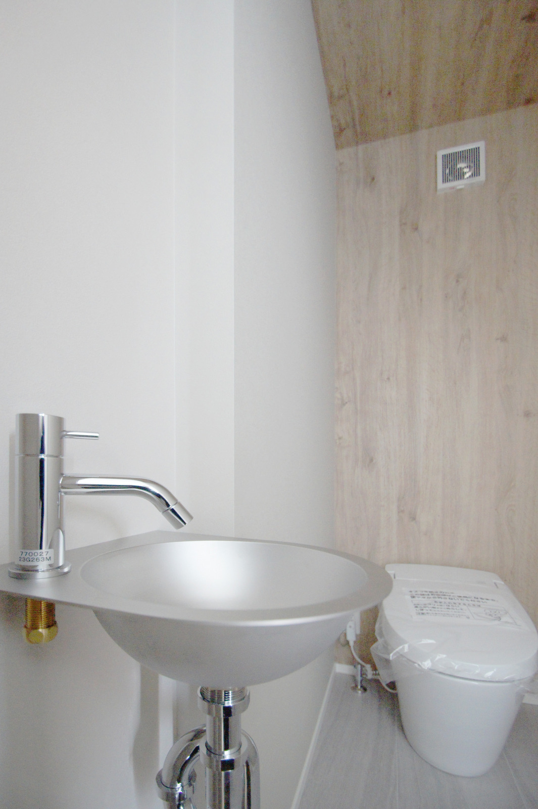 各所のアクセントクロスチョイスがおしゃれで、真鍮スイッチプレートやタオルストッカーなどこだわりアイテムもポイント!
