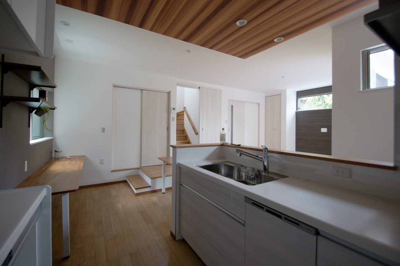 一段下がったサンクンキッチン、造作のダイニングテーブルと堀込風カウンターが印象的なお家です。