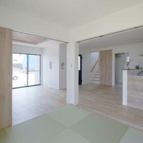 LDKと繋がり回遊性の高いタタミスペースや、リビングの天井アクセント、木目がかわいい洗面台&棚板、2階居室のそれぞれカラーの違うドアなど、こだわりが沢山詰まったお家です。