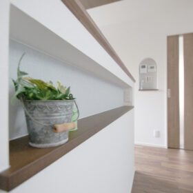 吹抜で明るい階段踊り場にはウォールシェルフを取付、より印象的な雰囲気に。
