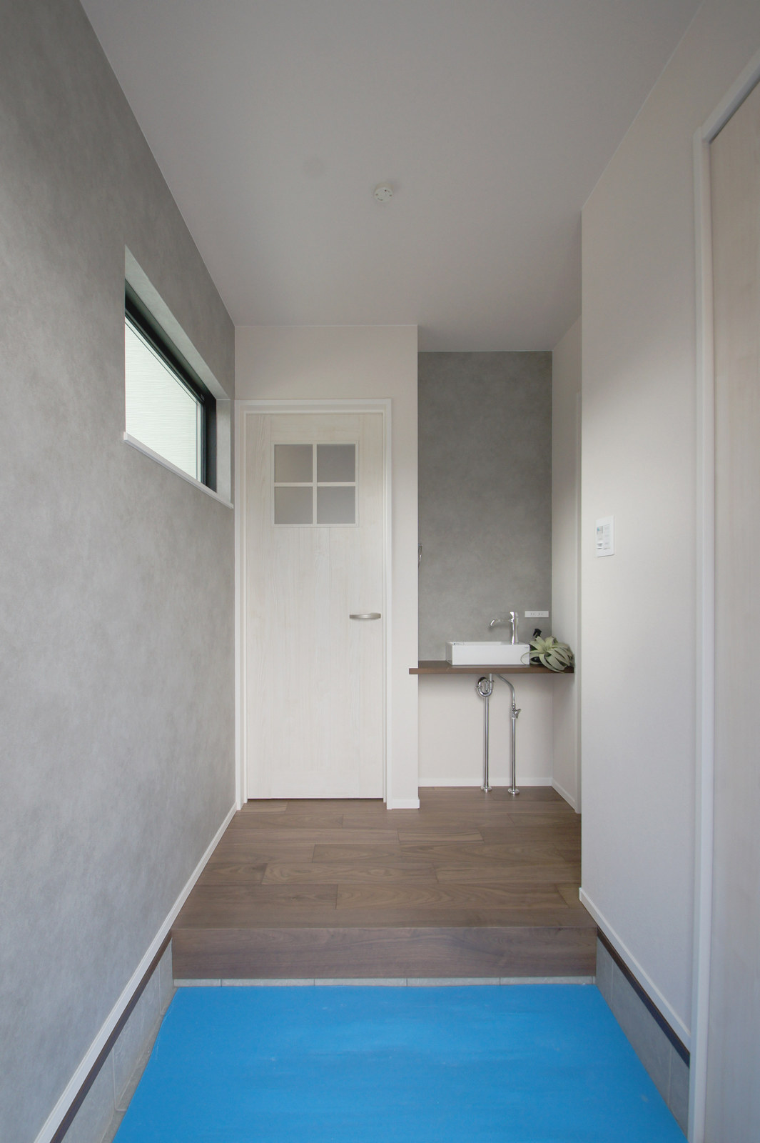うれしいシューズクロークや手洗いスペースのある玄関は、モルタル調のアクセントクロスや四角い窓のついた板張り調デザインドアで雰囲気のある空間に。