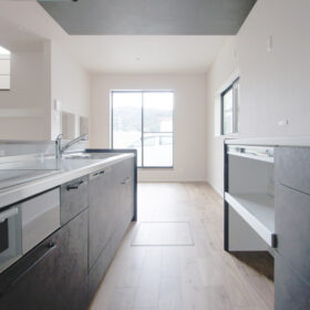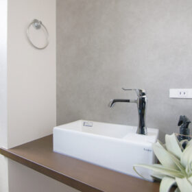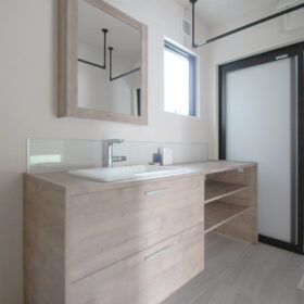 キッチン⇔パントリー⇔洗面脱衣室と回遊できる動線が暮らしやすく、洗面化粧台は木の質感やぬくもりを感じる木目調カウンタータイプ、TOTO『ドレーナ』で使いやすくおしゃれなデザインです。