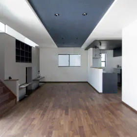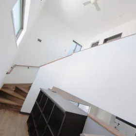 LDKは折り上げ天井のアクセントや階段スキップフロアのシェルフが上質でおしゃれな第一印象に。