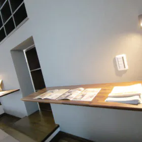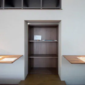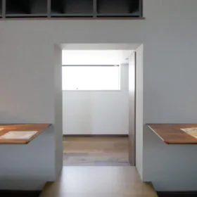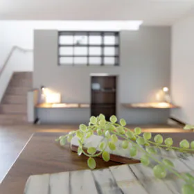 階段スキップフロア前にはシンメトリーな堀込風のカウンター&スライドする棚で隠し部屋風スペースも。