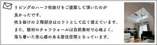 しっかりと丁寧に造って頂いている家だなぁという印象です。 所々に木の暖かみを感じるので住んでいて落ち着いた気分になります。 吹き抜け階段や堀り床のリビングといった遊び心のある所に惹かれて購入を決心しましたが、飽きが来ず、毎日充実しています。 ありがとうございます。 -